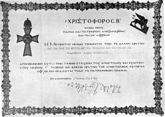 Commendation by the Pope and Patriarch Chistoforos B' of Alexandria and of All Africa