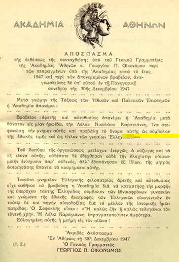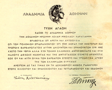 Commendations (accompanied with Medals for bravery and sacrifice) awarded to Lela Carayannis by the Academy of Athens.
