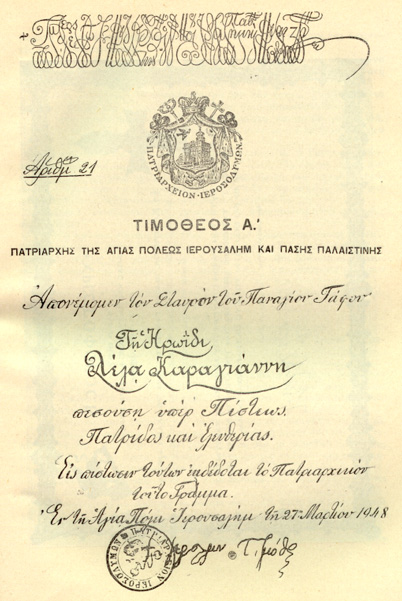 Commendation by Patriarch Timotheus A' of the Holy City of Jerusalem and All Palestine